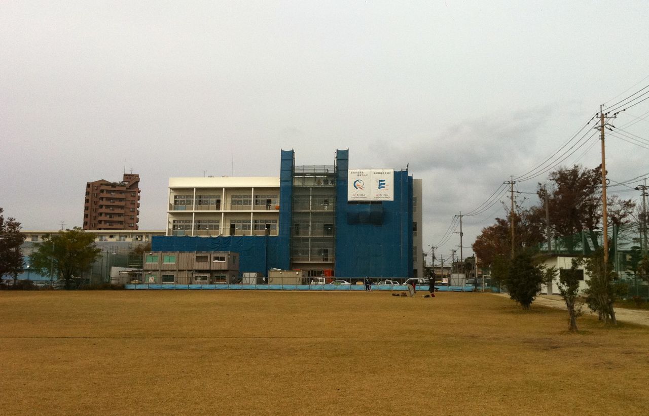 さて、先週まで囲いにおおわれていた建築中の中学校新校舎ですが、